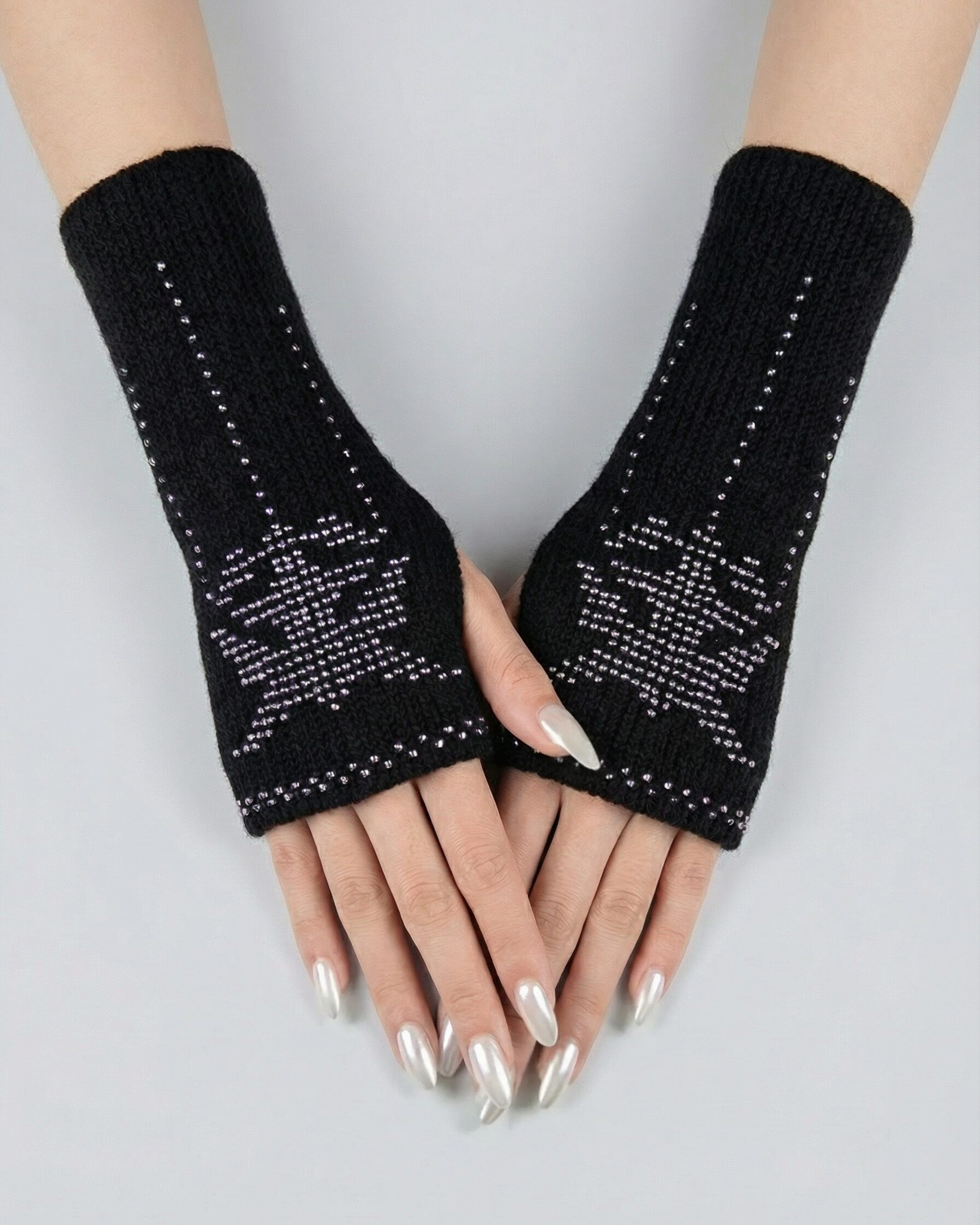 Black wrist warmer with pastel beads made from a yarn blend of 75% merino wool and 25% acrylic, providing warmth, softness, and durability. The fingerless design keeps wrists warm while allowing free movement of the fingers, making them suitable for daily use, work, or light outdoor activities.