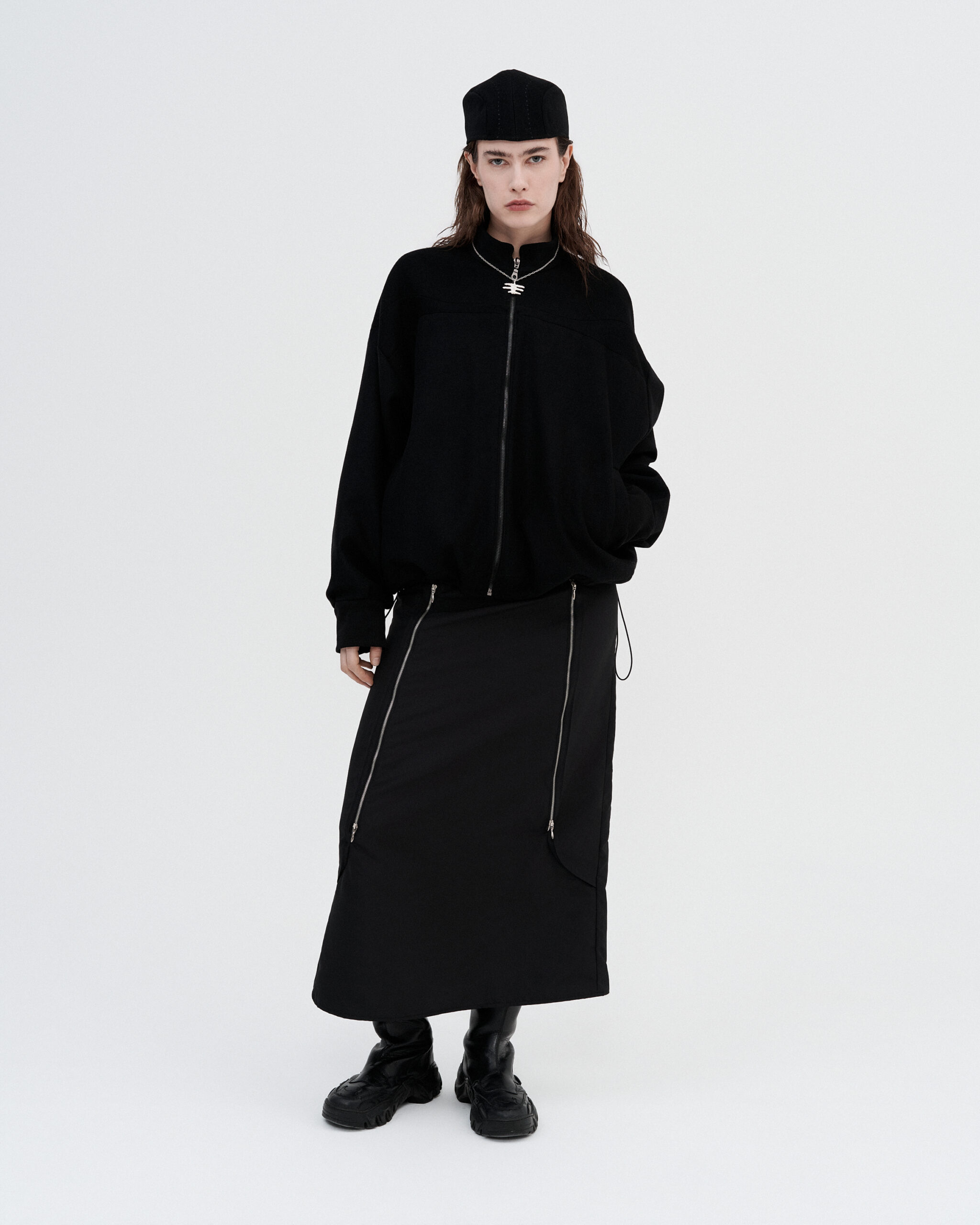 Oversized zip-up jacket crafted from wool. Sculptural panel lines and voluminous sleeves create a bold yet refined silhouette, balanced by a clean neckline. A statement layer designed for effortless, modern contrast.