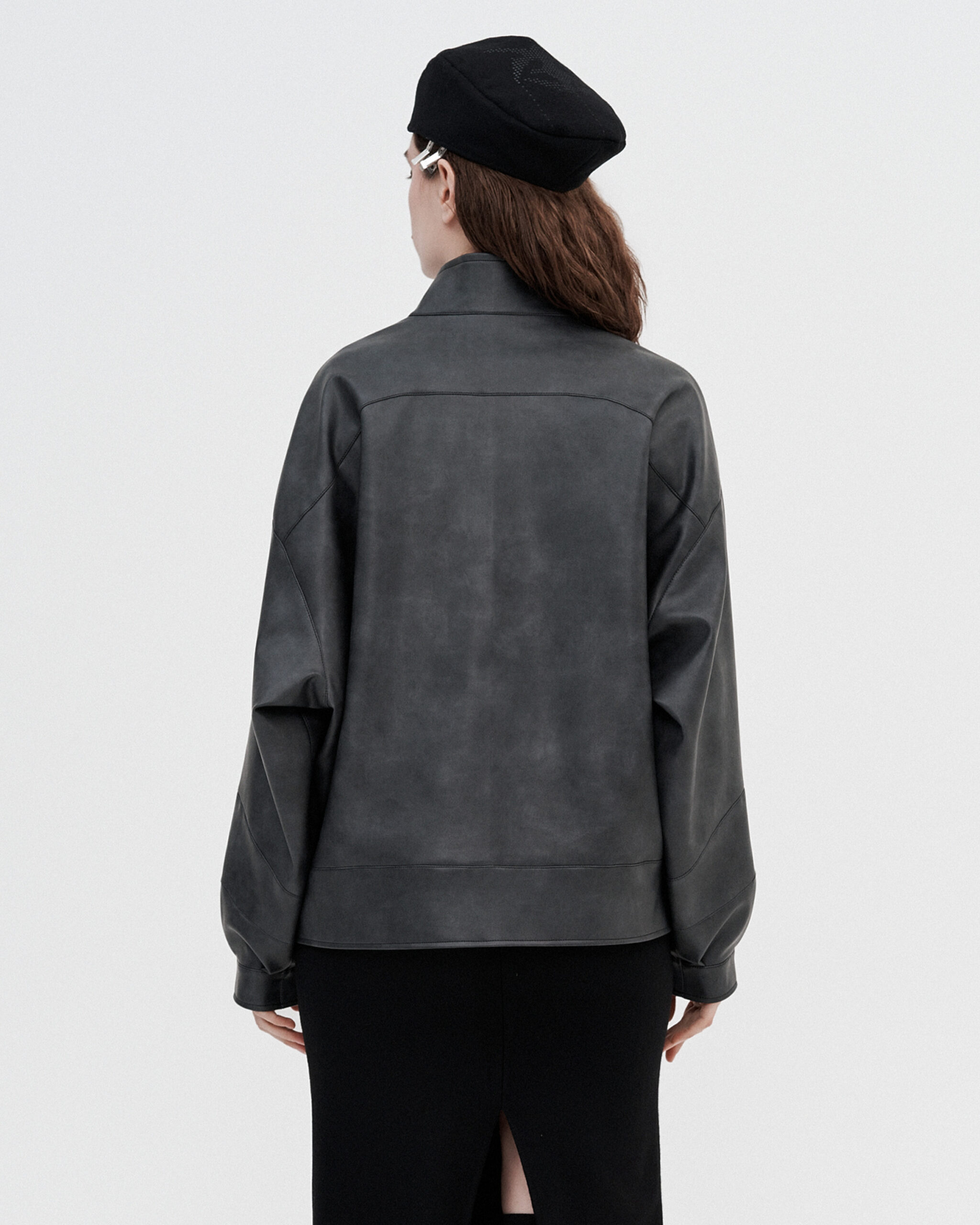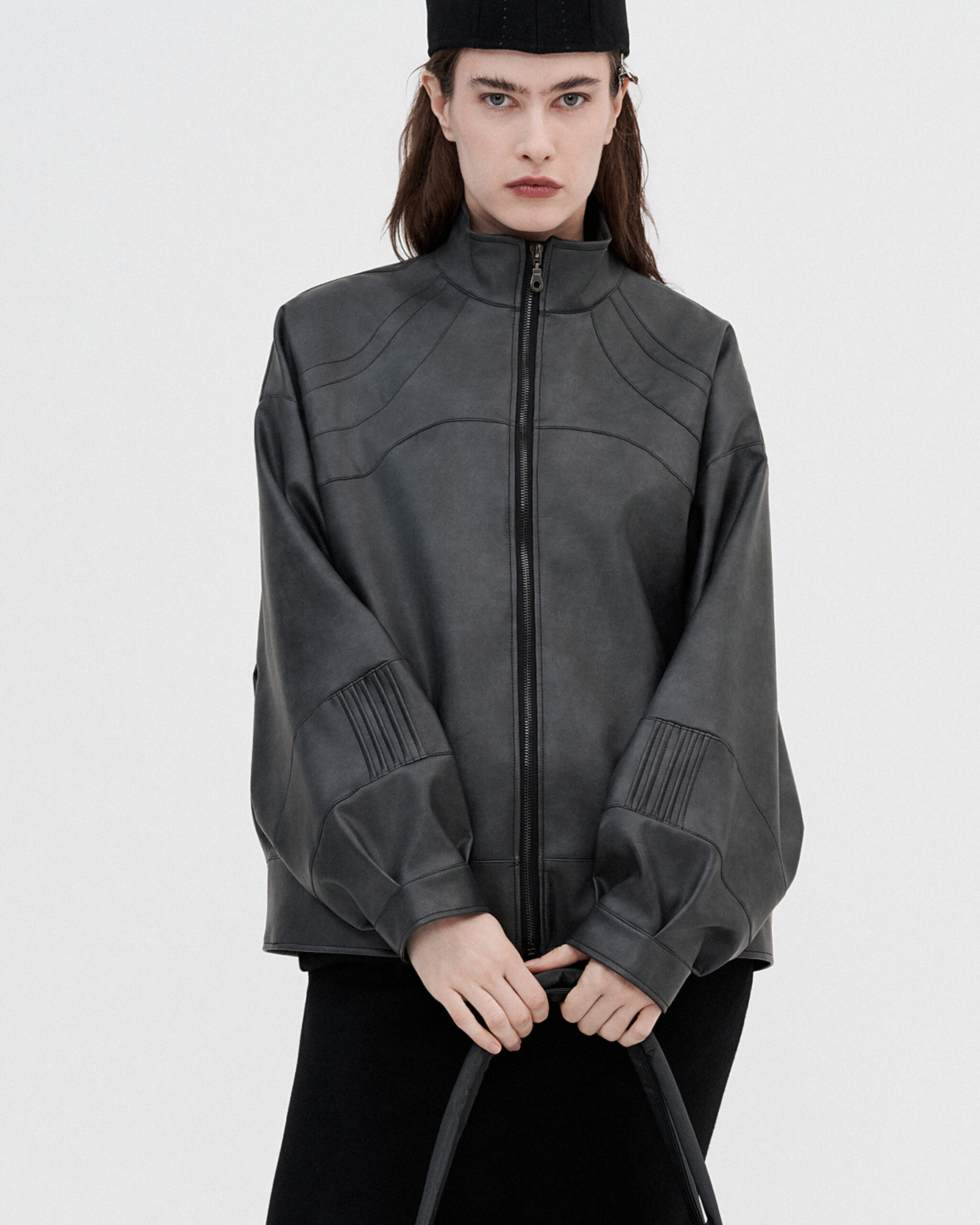 Oversized zip-up jacket crafted from supple vegan leather in a deep graphite tone. Sculptural panel lines and voluminous sleeves create a bold yet refined silhouette, balanced by a clean high neckline. A statement layer designed for effortless, modern contrast.