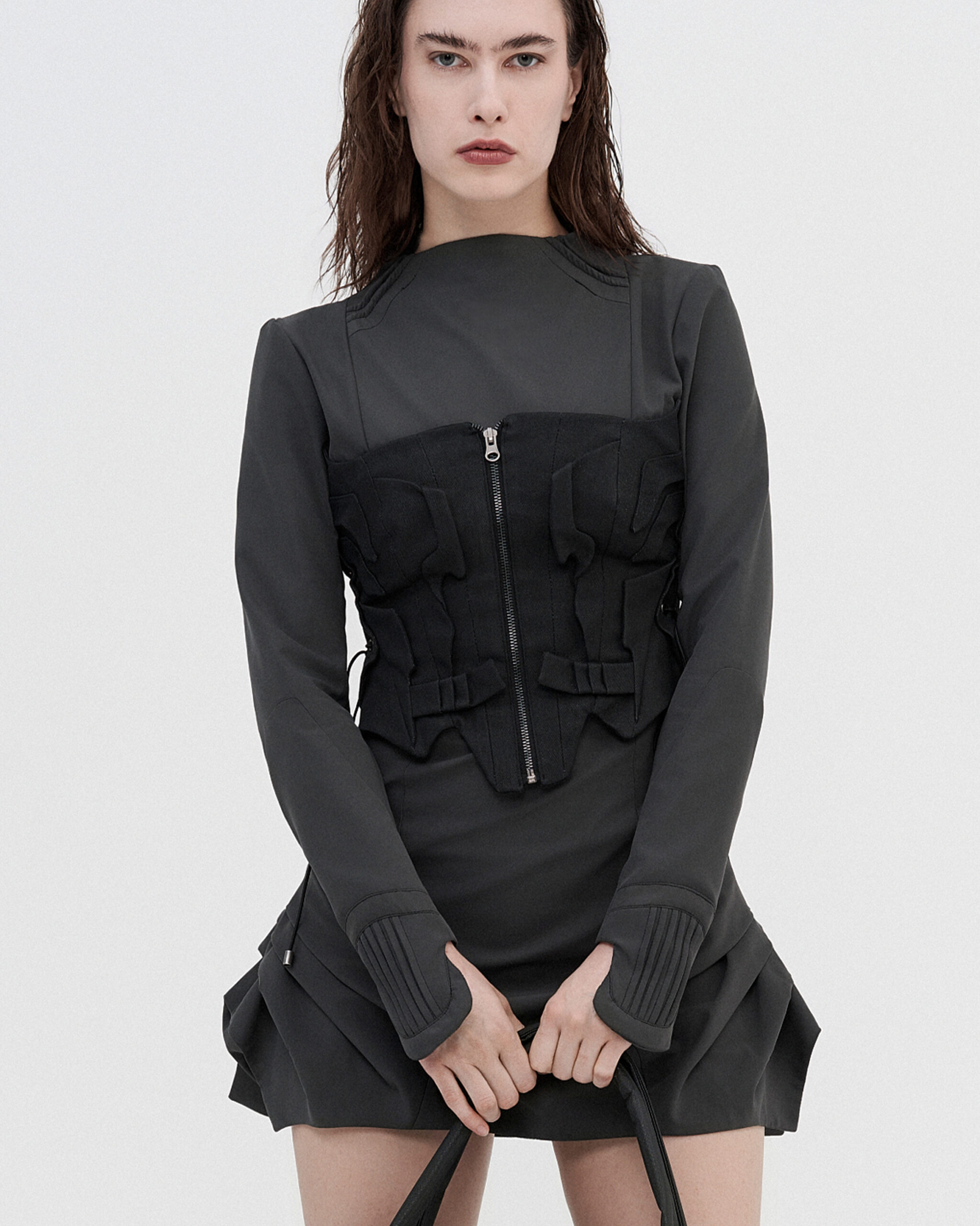 This corset is made to reflect the energetic and experimental spirit of hyperpop in various deformed details. This black corset has a winged design with pleating and lacing on the sides.