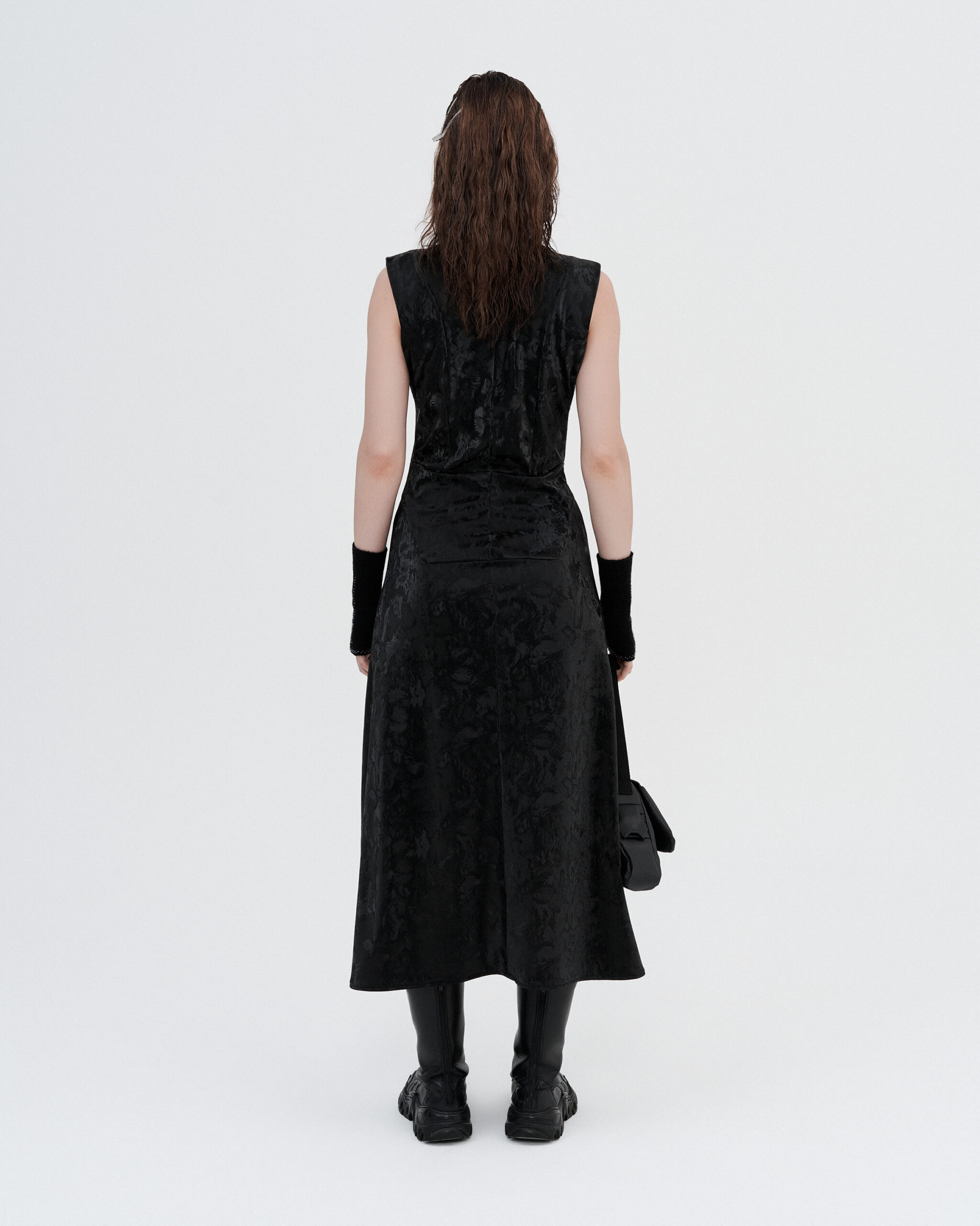 Sleeveless midi dress in a glossy fabric with a tonal floral finish. Cut close through the bodice and falling into a fluid skirt, it plays with light and movement. Clean, sharp, and modern.
